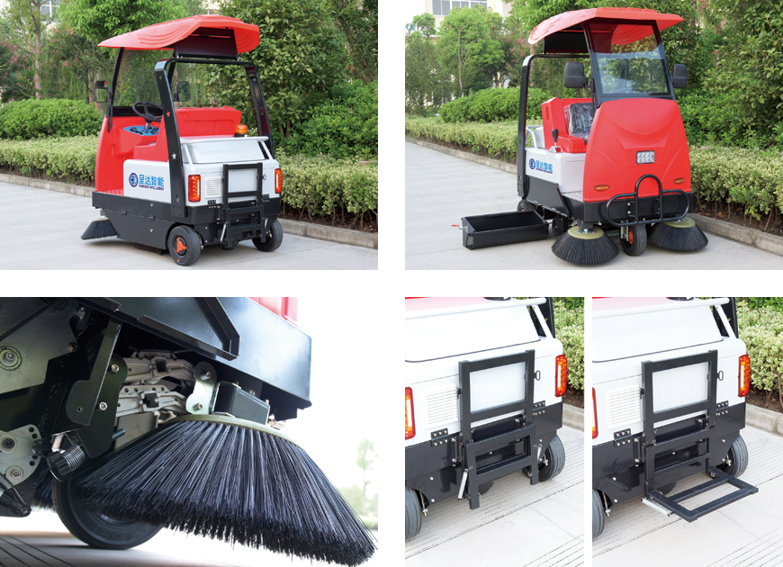 4. 智能主刷,清掃時可根據(jù)磨損的多少來自動調(diào)節(jié);主刷前置擋板垂直提升,高度可達(dá)80mm,能有效的清掃更大的樹葉和石塊;40L垃圾箱,便于手提直接倒到垃圾桶內(nèi)。40L的水箱加上高壓水泵和不銹鋼霧化扇形噴嘴,起到有效的控塵作用。